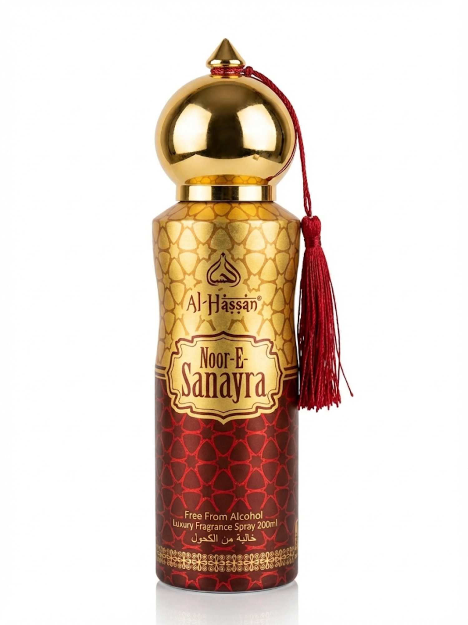 This is a 200 ml bottle of Al-Hassan Noor-E-Sanayra, a luxury fragrance spray. It is described as being free from alcohol. The product comes in a decorative gold and red bottle with a matching tassel and a gold cap.