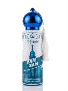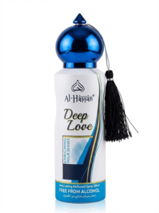 This is a 200 ml can of Al-Hassan Velvet Rose, a long-lasting perfumed spray. It is described as being free from alcohol. The pink canister features an ornate design with a shiny pink cap and a matching tassel.