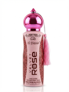 This is a 200 ml can of Al-Hassan Zam Zam, a long-lasting perfumed spray. It is described as being free from alcohol and features a blue and white design with an illustration of the Makkah Royal Clock Tower.