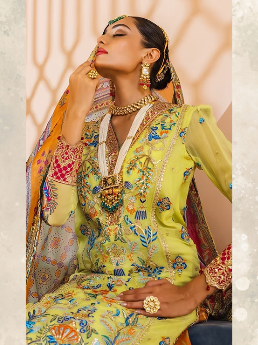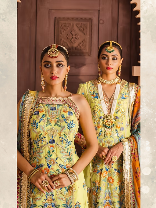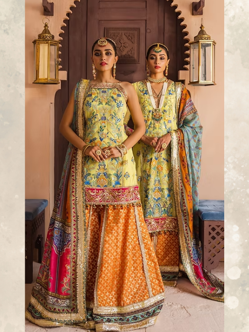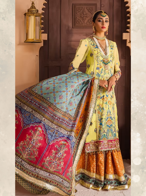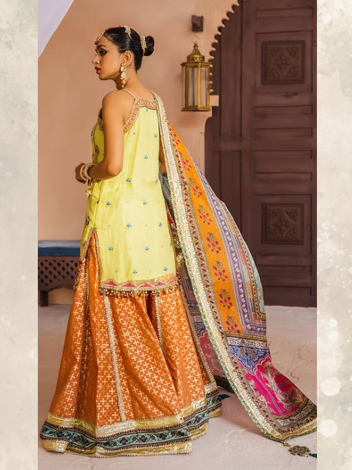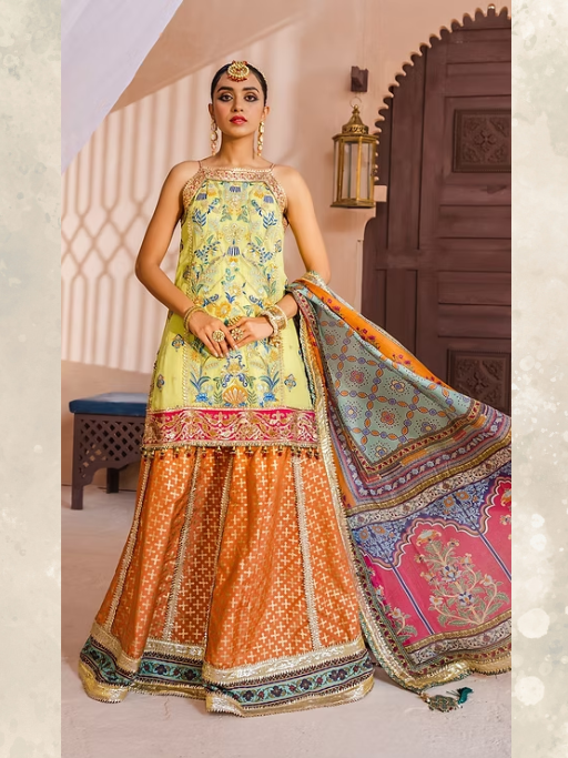A soothing lemon yellow canvas is beautifully accentuated with intricate floral embroideries inspired by traditional Persian gardens, and is further adorned with a stunningly embellished hot pink border in “Shazmeen”. It is paired with a wide legged digitally printed vibrant orange sharara adorned with bright borders and an equally stunning mult-colored digitally printed tissue silk dupatta highlighted with a shimmering border on all four sides.